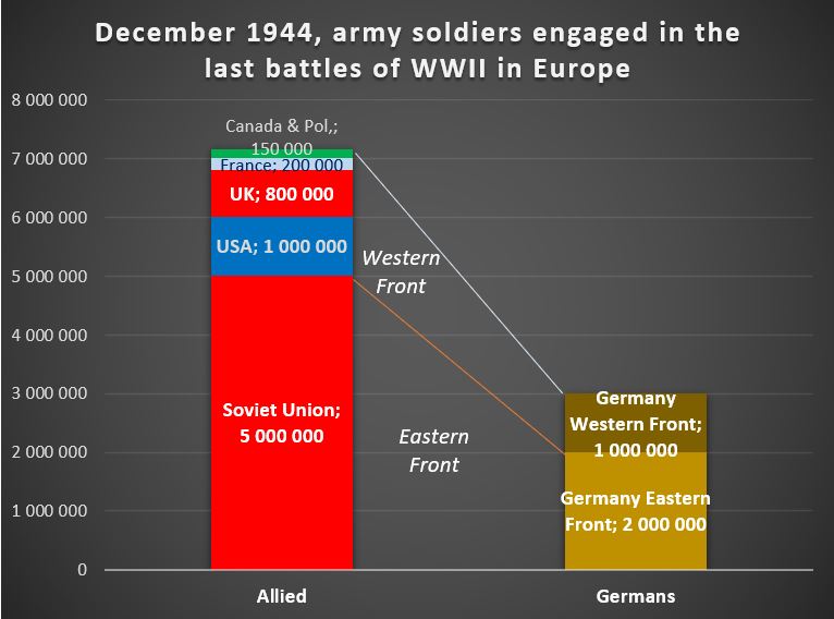 Although it is impossible to have exact numbers, the graph below shows the order of magnitude of the ground forces – excluding air and navy – present in Europe at the end of 1944 – early 1945.
