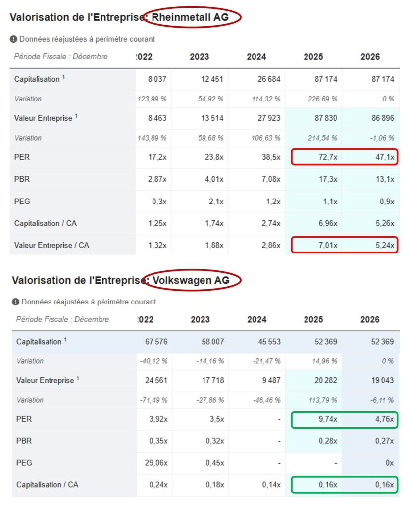 Yet striking to see the PER (Price Earning Ratio ie ratio between value of a company and its actual or expected profits) of 5 to 10 for automotive vs 40 to 60 for defense.