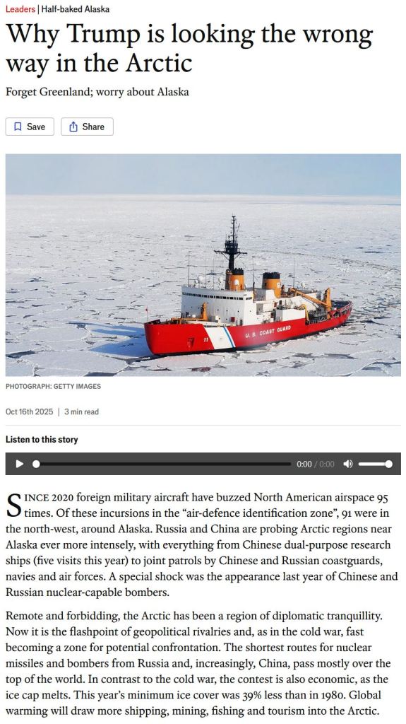 My second and last topic is to echo & share a smart anlysis done by the excellent « The Economist »: The main threat in the artic from Russia and China is not on Groenland but on Alaska. ie not on the Atlantic side but on the Pacific one.